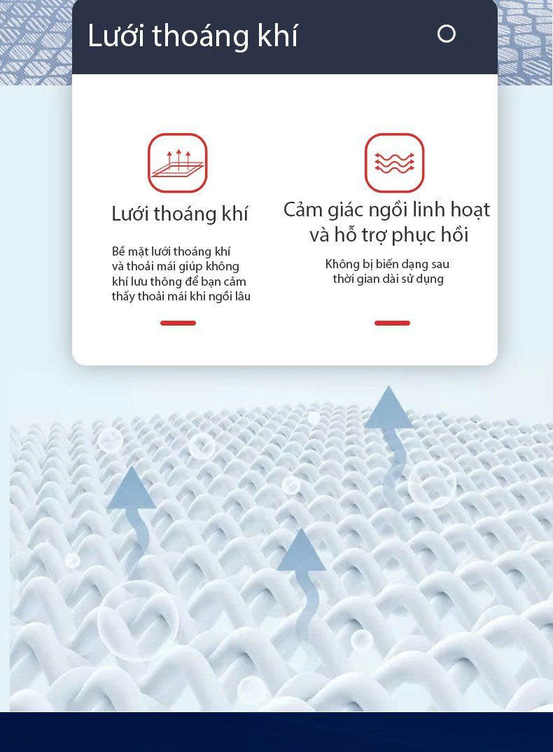 - Lưng ghế bằng lưới thoáng khí, phù hợp với thời tiết nóng ẩm, giảm cảm giác hầm lưng