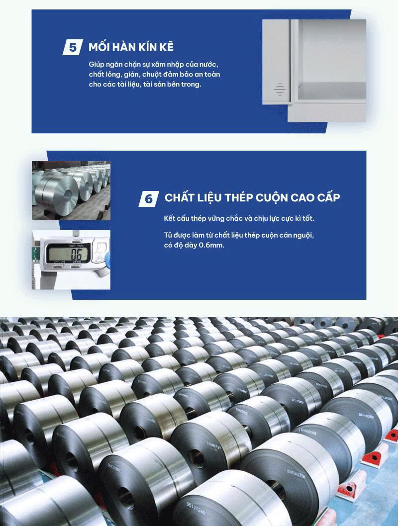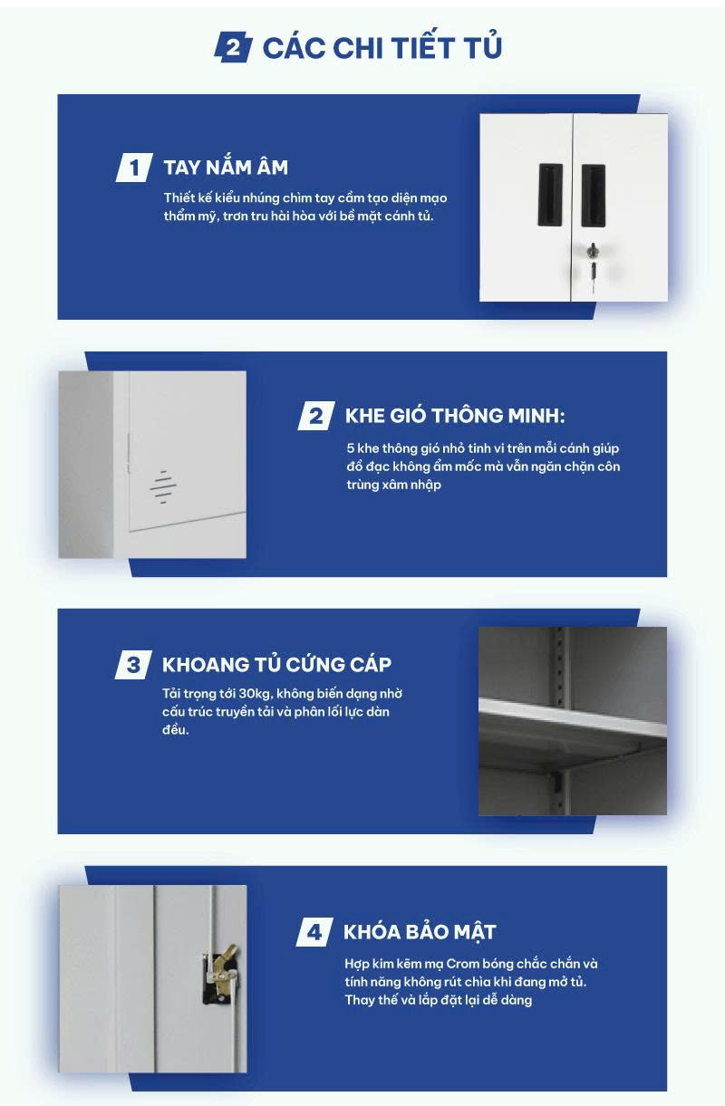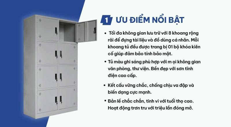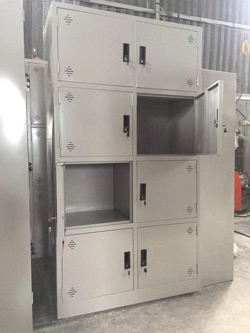 Kiểu dáng: Dạng tủ đứng cao hàn liền khối được chia thành 8 khoang riêng biệt, tủ có 8 cánh kèm 8 khóa liền Locker,tay nắm âm bằng nhựa kiểu hiện đại.